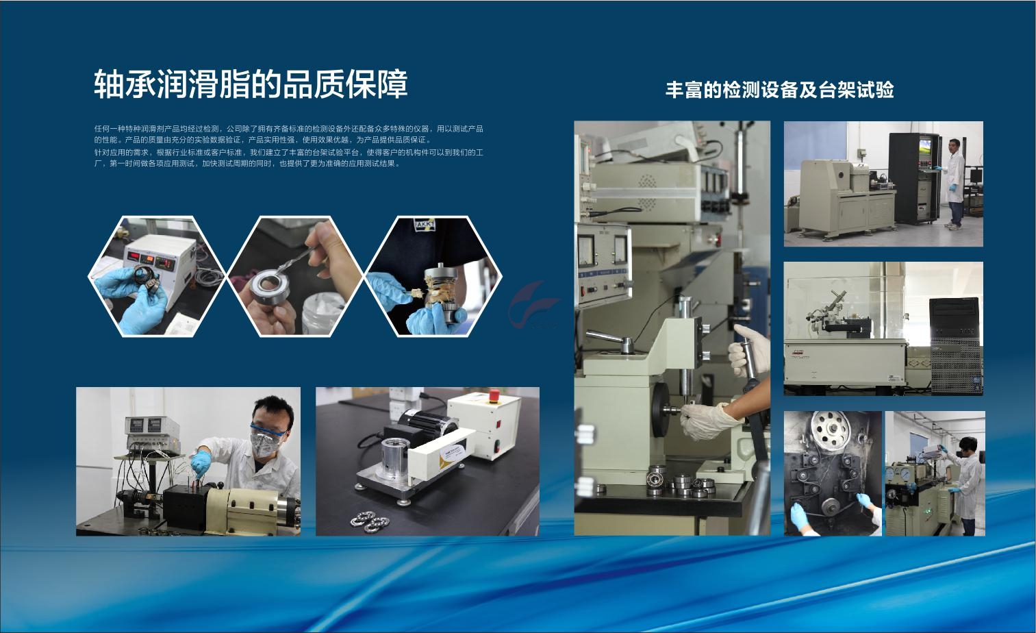 合誠潤滑FAKKT弗克)旗下的任何一種特種油脂,均經過嚴苛的檢測流程,公司除了擁有齊備標準的檢測設備之外,還配備諸多特殊檢測儀器,用以測試產品的性能,以保證輸出的產品優質無瑕。質量保障是合誠潤滑FAKKT弗克)給予客戶最基本的承諾,通過充分的數據驗證,合誠潤滑FAKKT弗克)的特種油脂產品具備超高實用性能,使用效果優越。而為了針對不同客戶的應用需求,合誠潤滑FAKKT弗克)根據行業標準或客戶標準,建立了豐富的臺架試驗平臺,使得客戶的機構件到達工廠時可以第一時間做各項應用測試,這在加快測試周期的同時也為客戶提供了更為準確的應用測試結果。